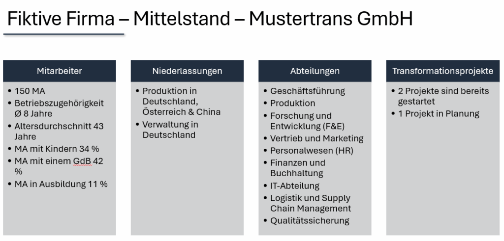 Die fiktive Musterfirma ist in verschiedene Bereiche unterteilt und bildet typische Strukturen im Projektumfeld ab.
