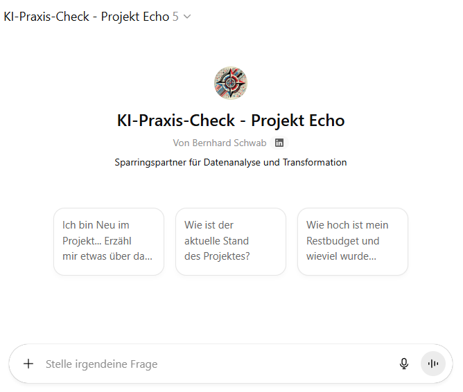 Entdecke, wie du Künstliche Intelligenz praktisch und unkompliziert testen kannst – direkt mit praxisnahen Beispielen und ohne aufwendige Vorbereitung. Mit diesem speziell entwickelten GPT greifst du auf rund zehn Jahre Bewegungsdaten einer fiktiven Firma zu, die verschiedene Projekte abbildet. So lassen sich zahlreiche Szenarien aus den unterschiedlichsten Anwendungsfeldern nachspielen.